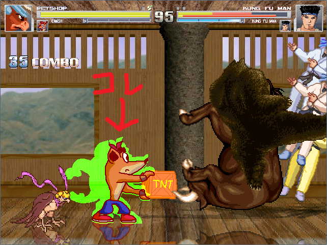 格ゲー界でもぶっちぎりに強いペットショップがいる為、バランス調整としてAIの貧弱なクラッシュバンディクーをチームに入れてみたところ、他のチームにほとんど勝てなくなってしまった。